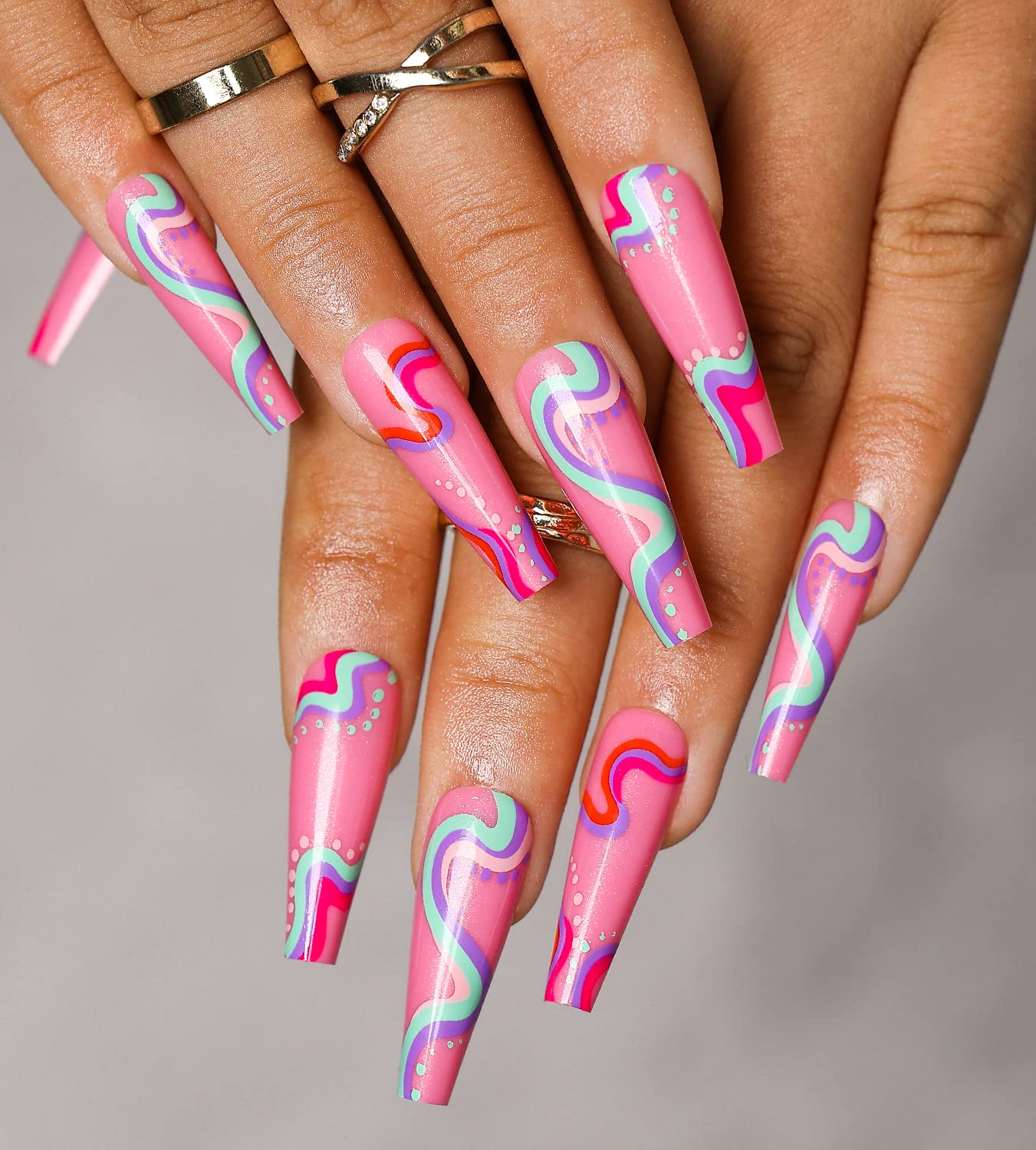 Amazon Com Press On Nails Long Artquee Rosy Red Coffin Shape Charming Colorful Swirls Designs Glossy Reusable Sturdy False Nail Tips Fake Nails Art In 12 Sizes 24pcs Nail Kit